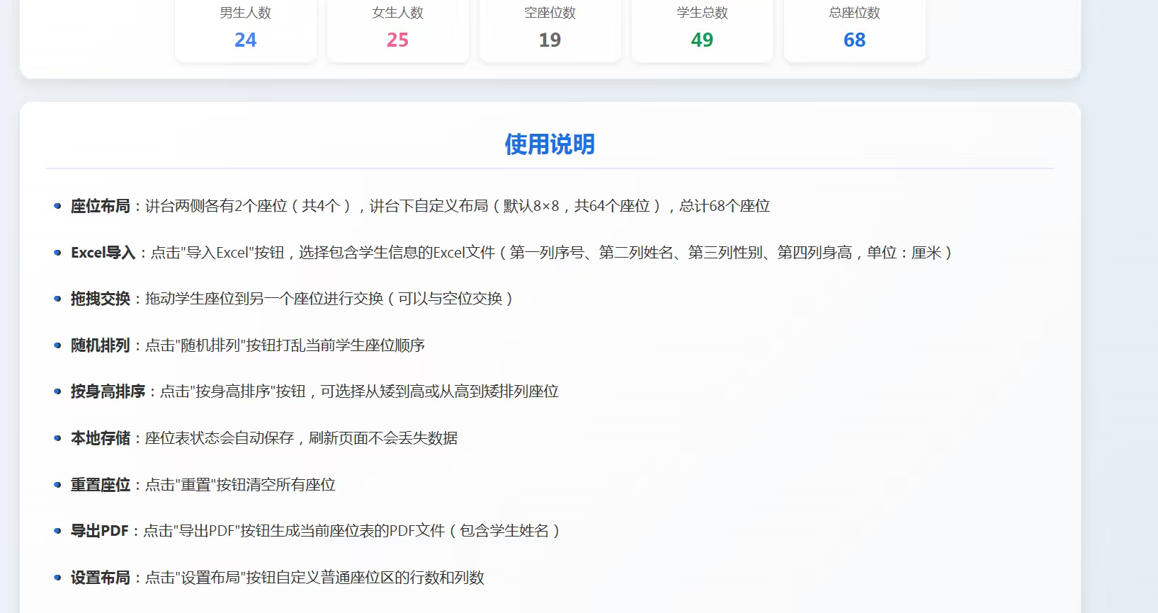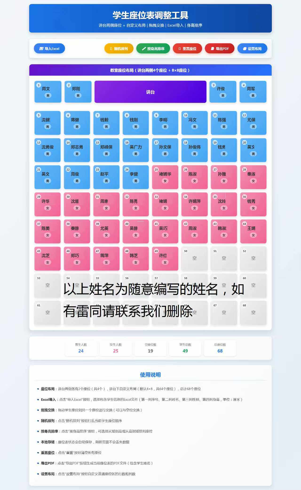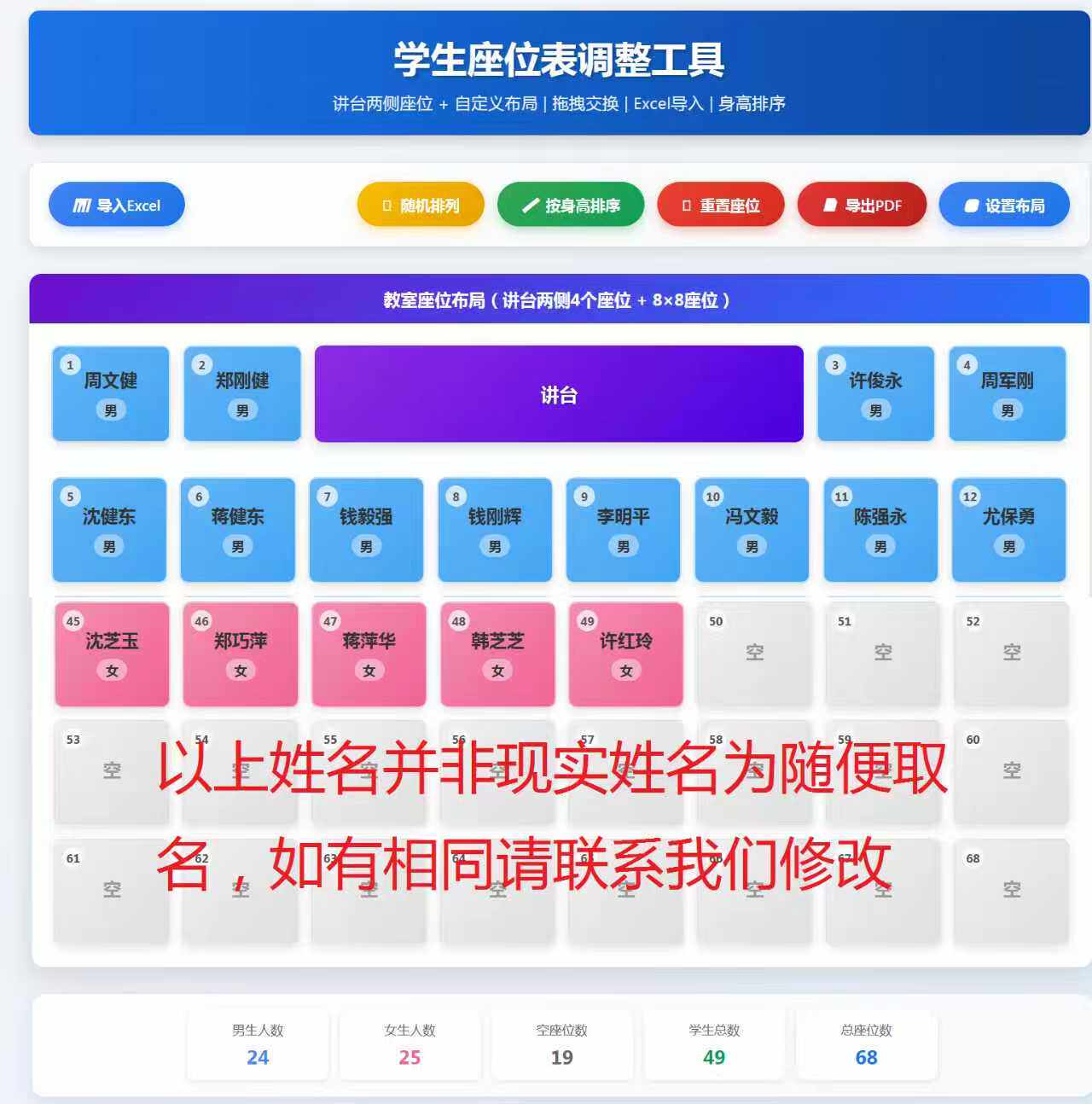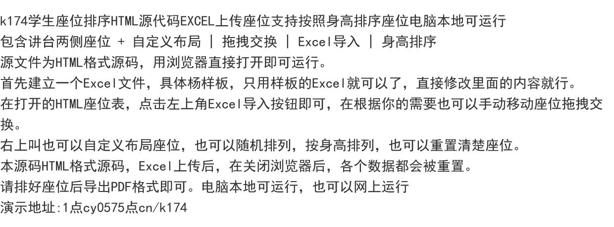 k174学生座位排序HTML源代码EXCEL上传支持按身高排PC本地可运行
